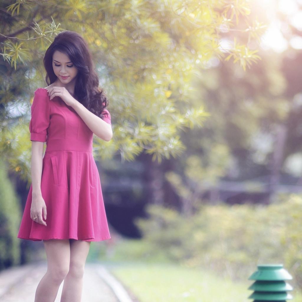 Wallpaper Asian in a red dress walks in the garden