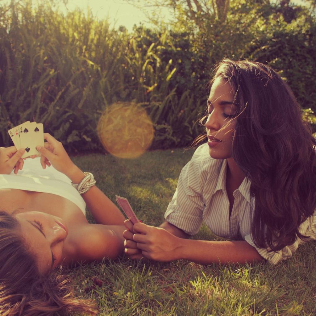 Wallpaper Girls playing cards on the lawn