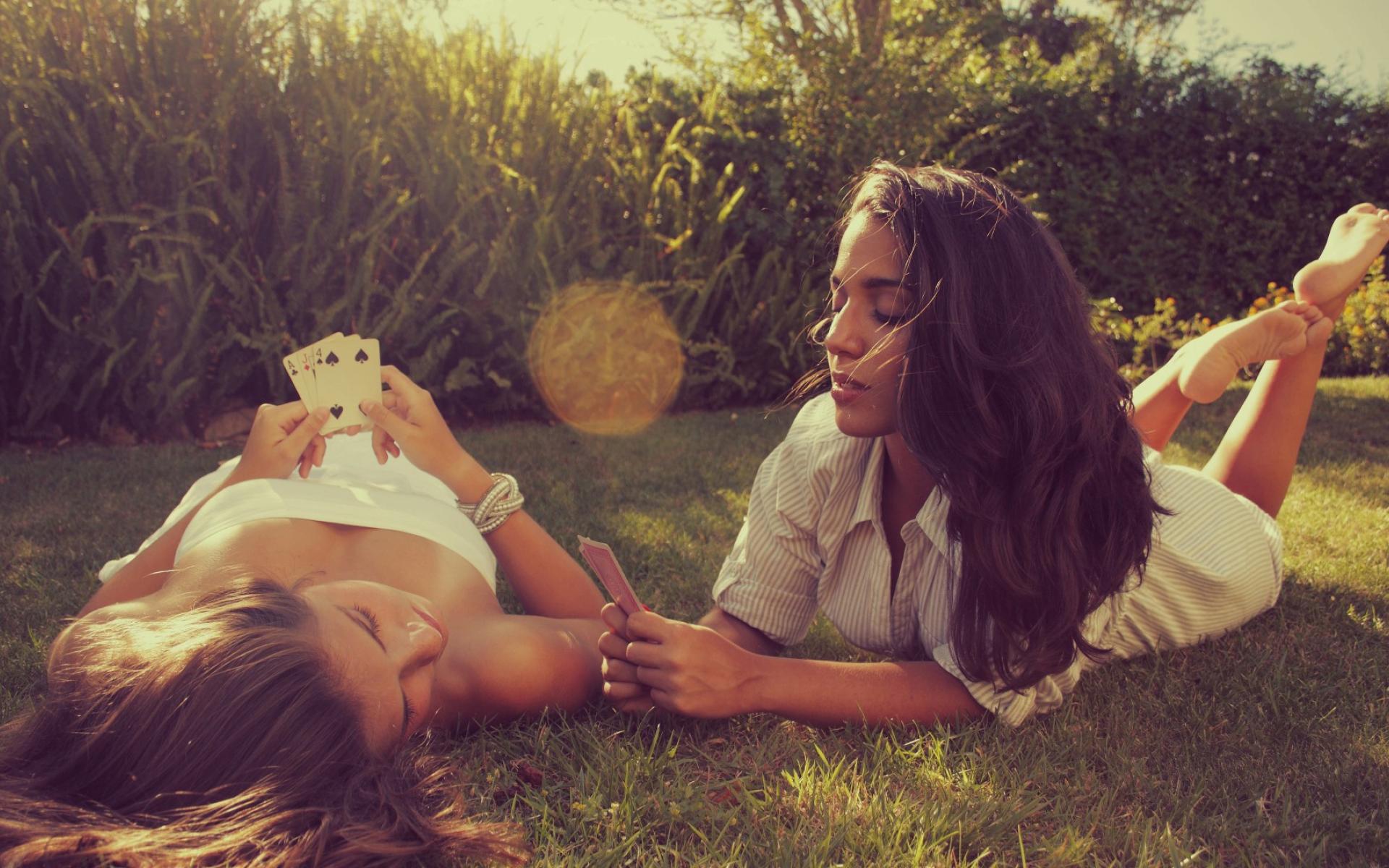 Wallpaper Girls playing cards on the lawn
