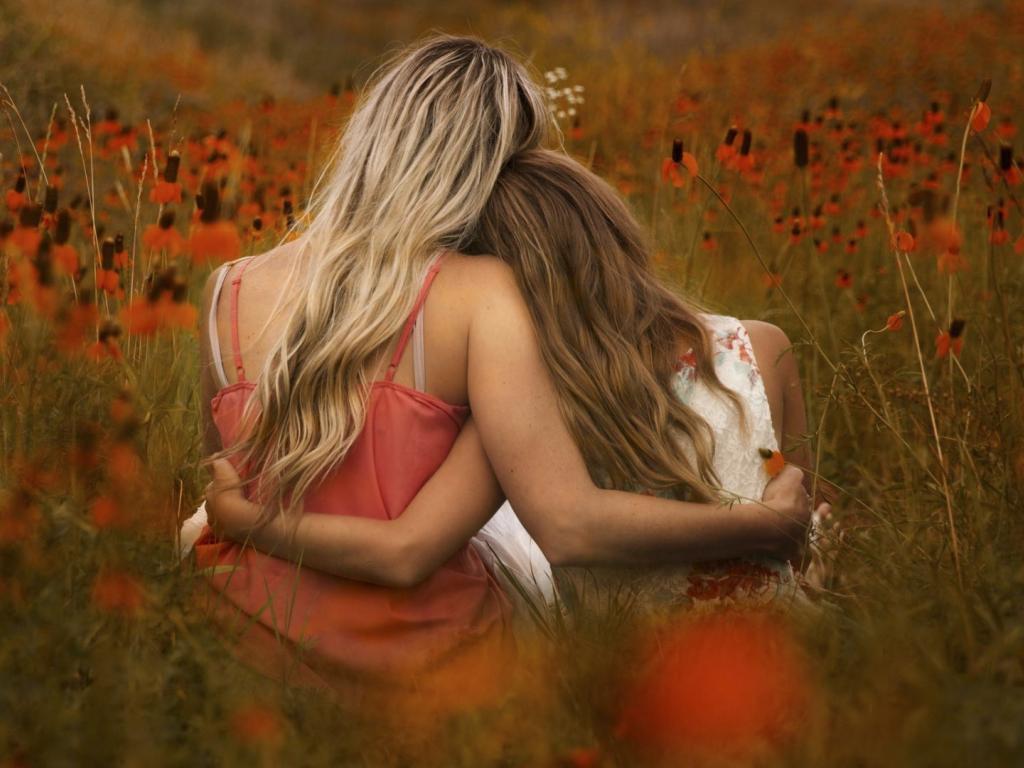 Wallpaper Two girls sit embracing in a field