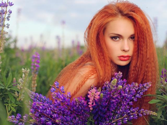Wallpaper Long-haired red-haired girl in a field of lavender
