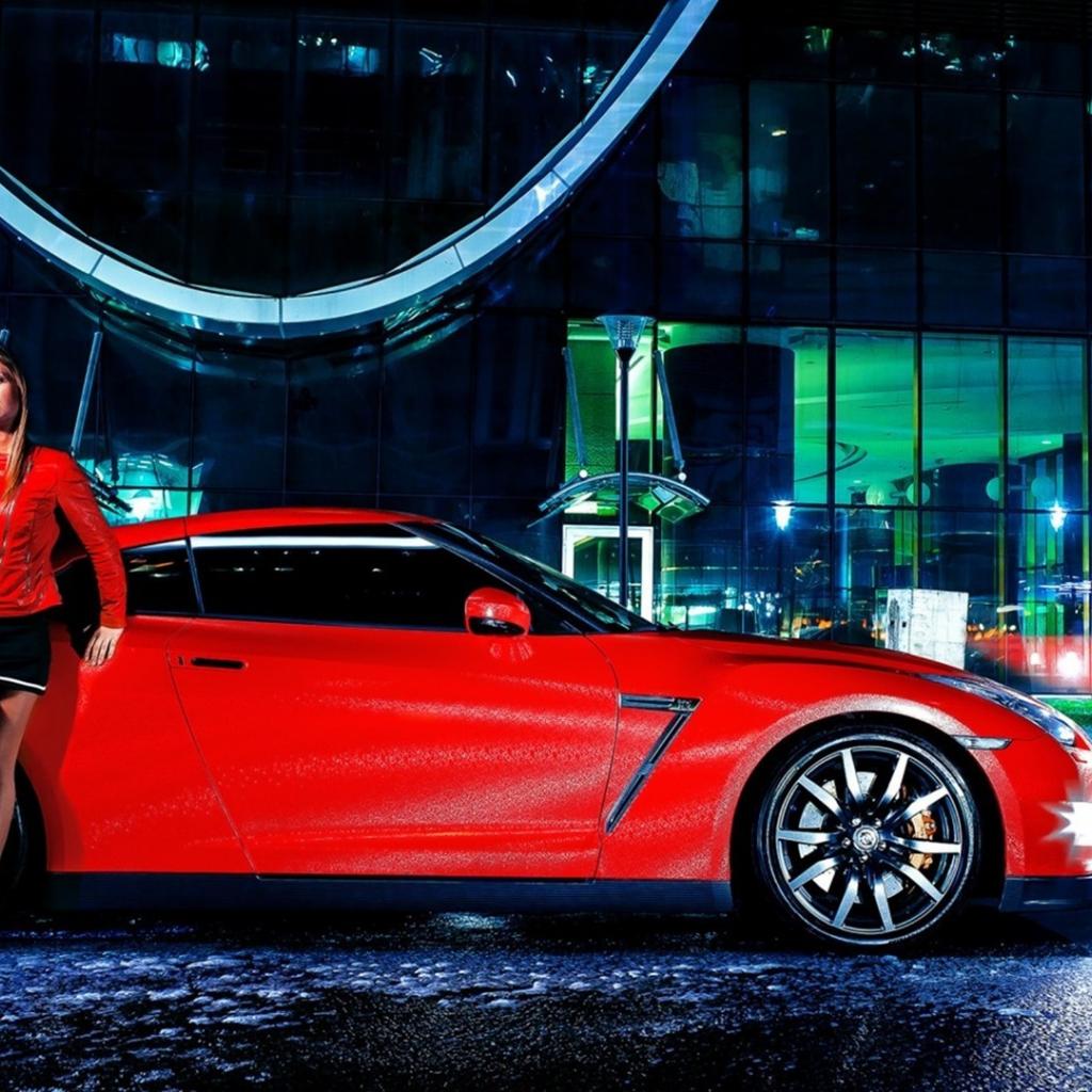 Wallpaper Girl in a red jacket in the car Nissan GT-R