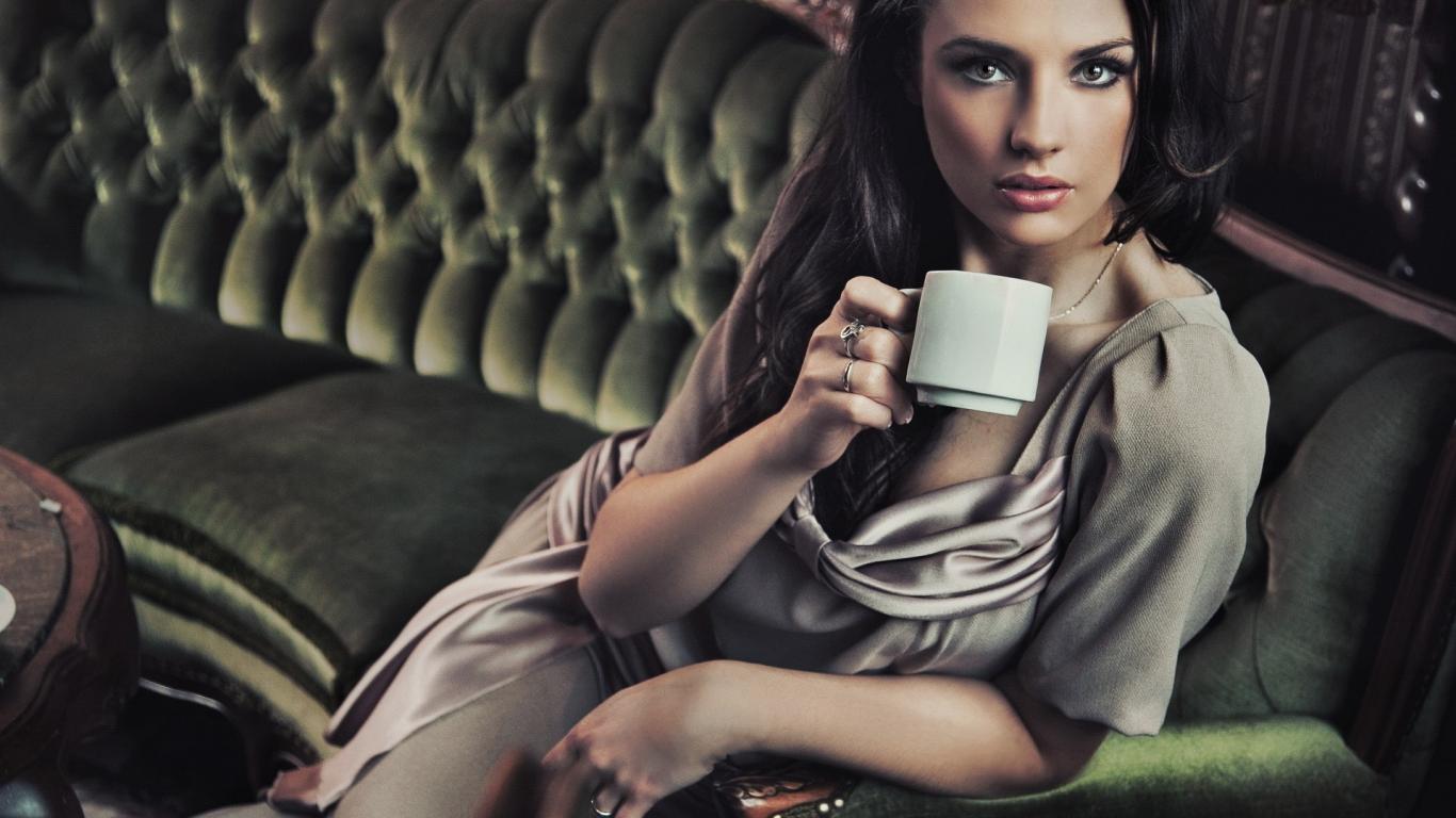 Wallpaper Brunette with a cup of coffee sitting on a sofa