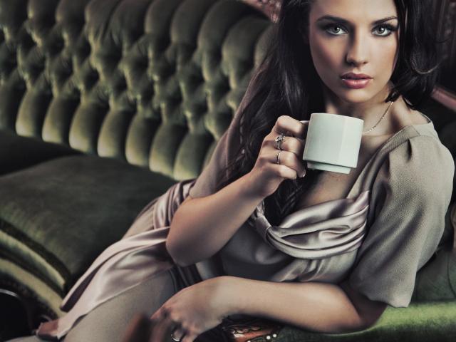 Wallpaper Brunette with a cup of coffee sitting on a sofa
