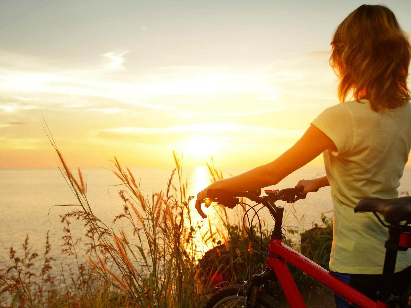 Wallpaper Girl with a bicycle watching the sunset
