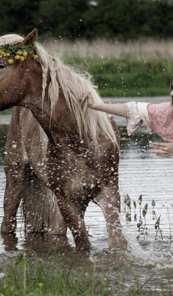 Wallpaper Girl bathe horse