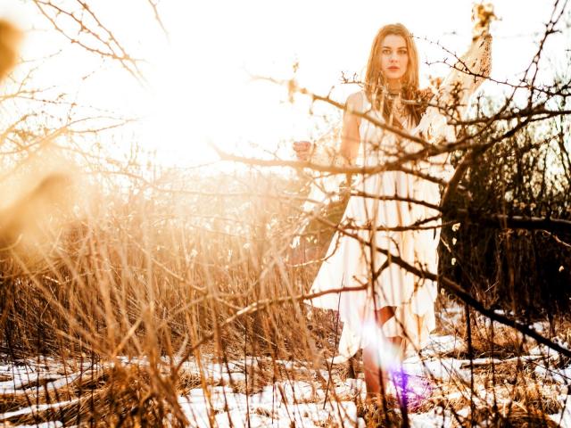 Wallpaper Blonde in a white dress on the snow