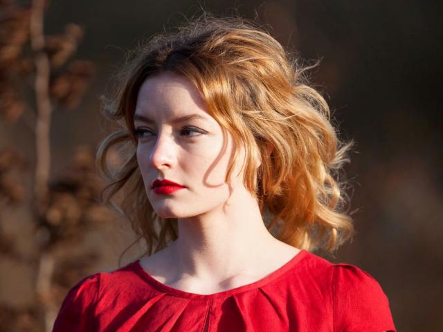 Wallpaper Red-haired girl in a red dress standing near the tree