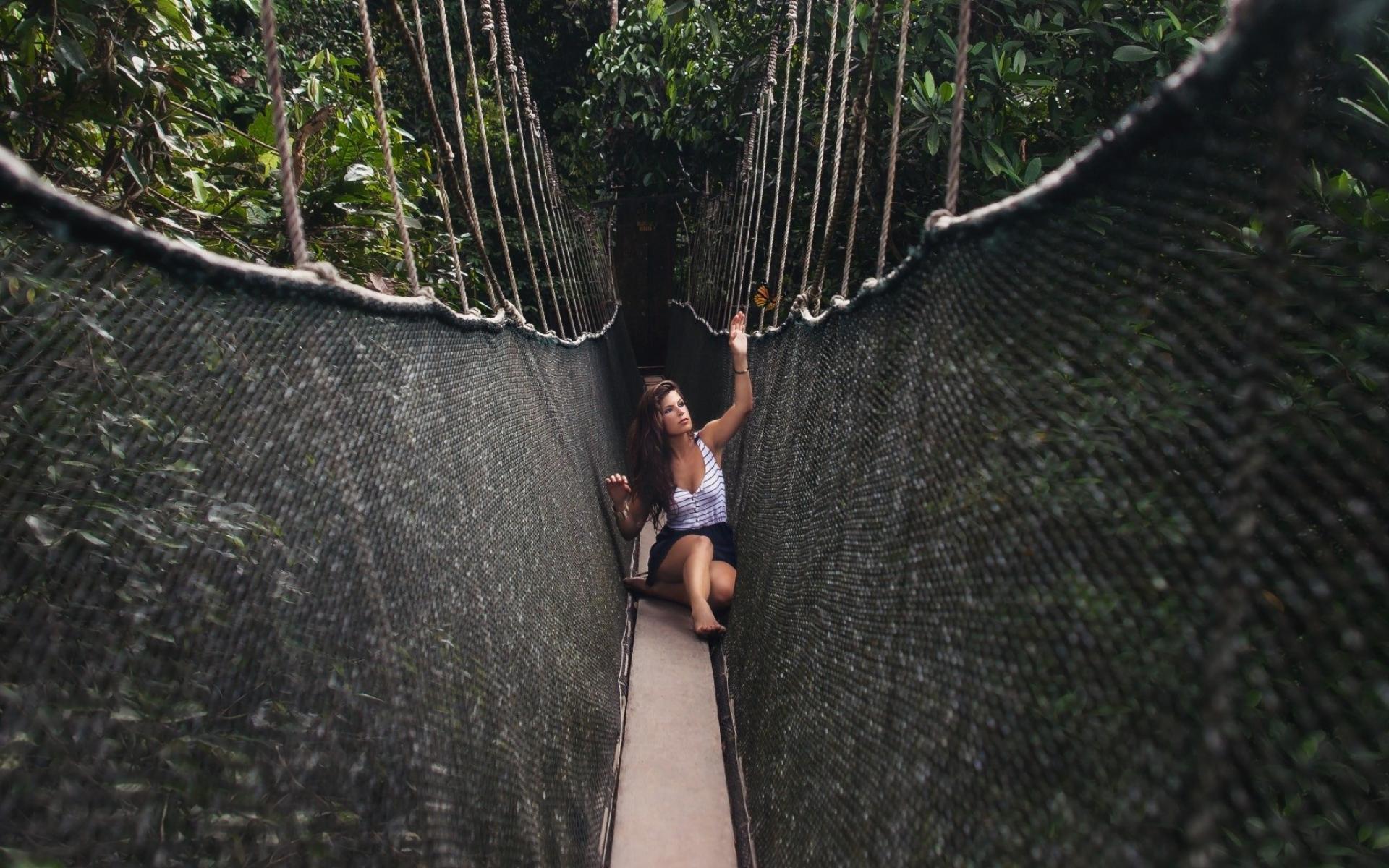 Wallpaper Girl sitting on a suspension bridge