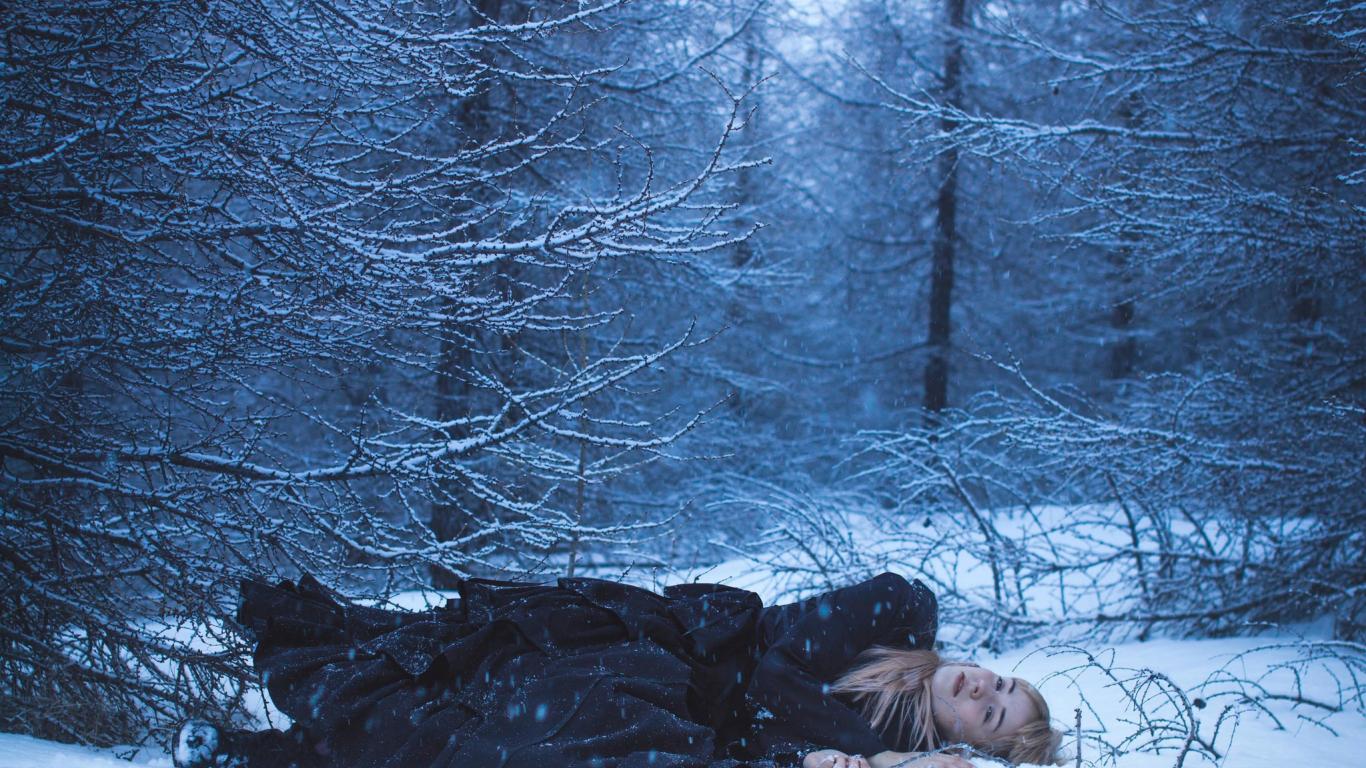 Wallpaper Blonde lies on the snow in the forest