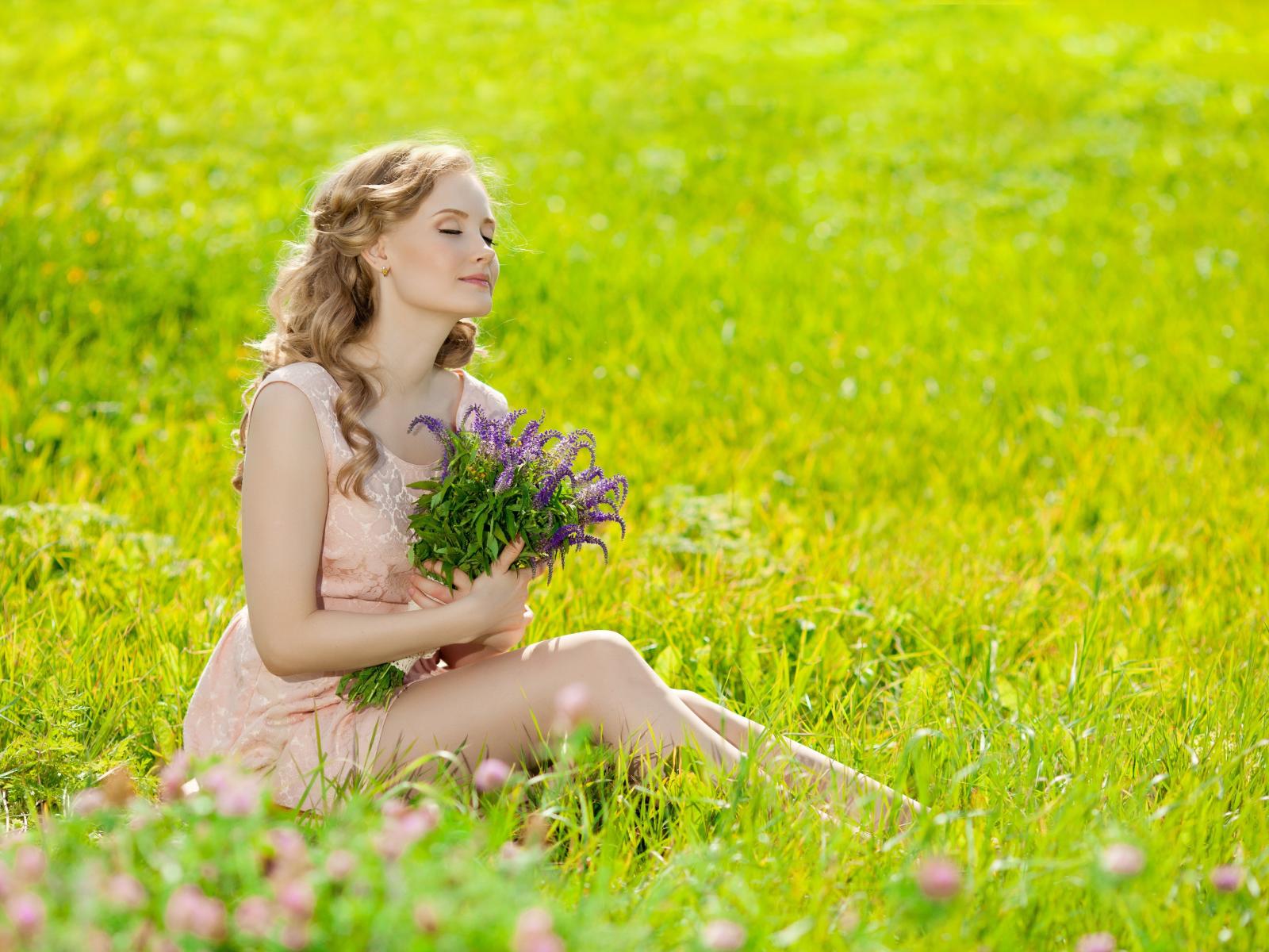 Wallpaper Girl with a bouquet sitting on green grass