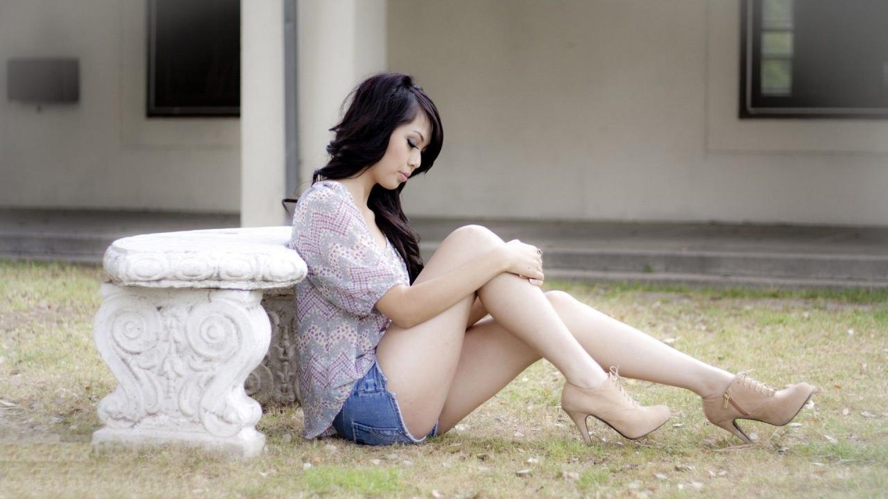 Wallpaper Brunette sitting on the ground near a stone bench