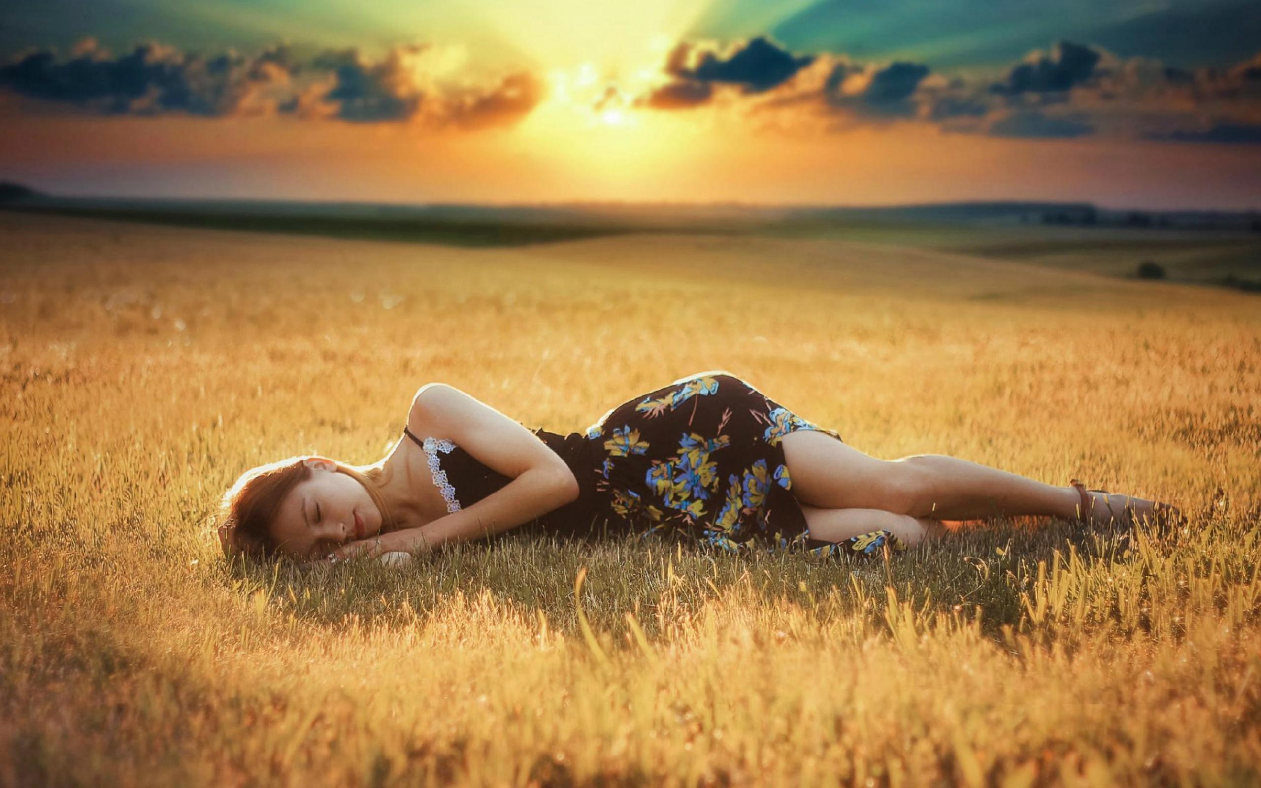 Wallpaper Girl lies on a sloping field