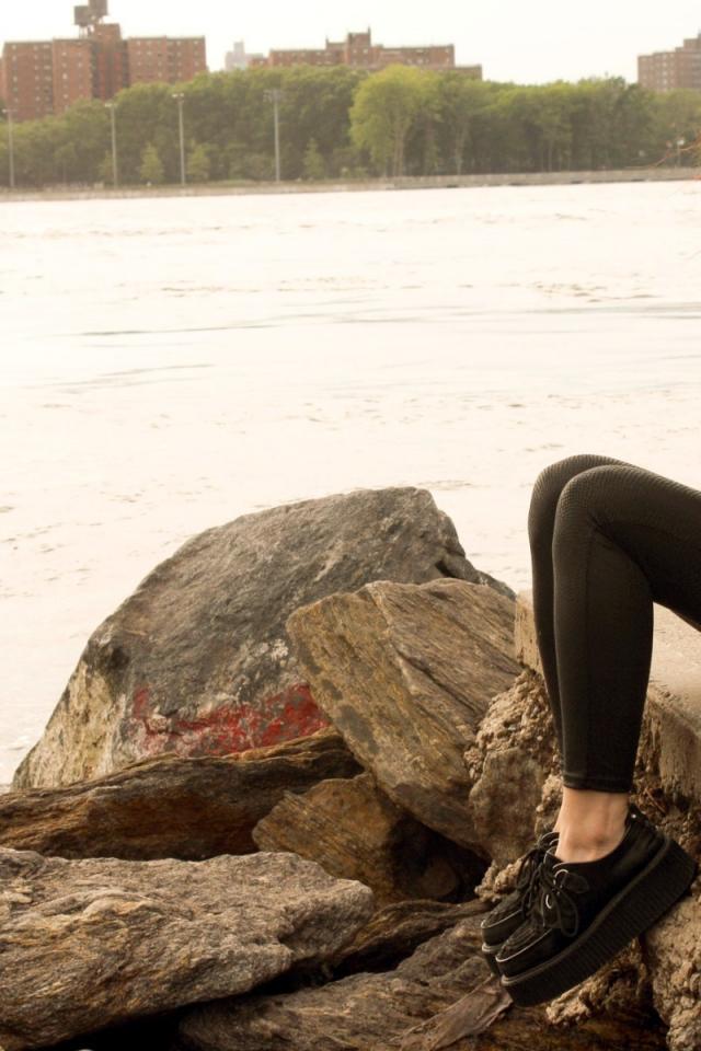 Wallpaper Red-haired girl sitting on the plates waterfront