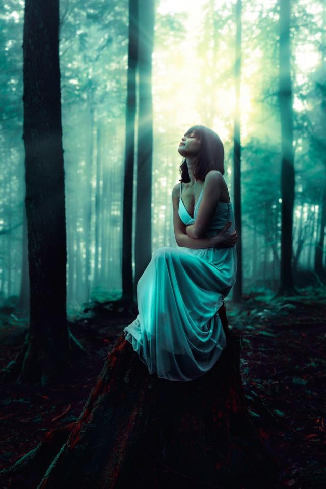 Wallpaper Girl sitting on an old tree stump