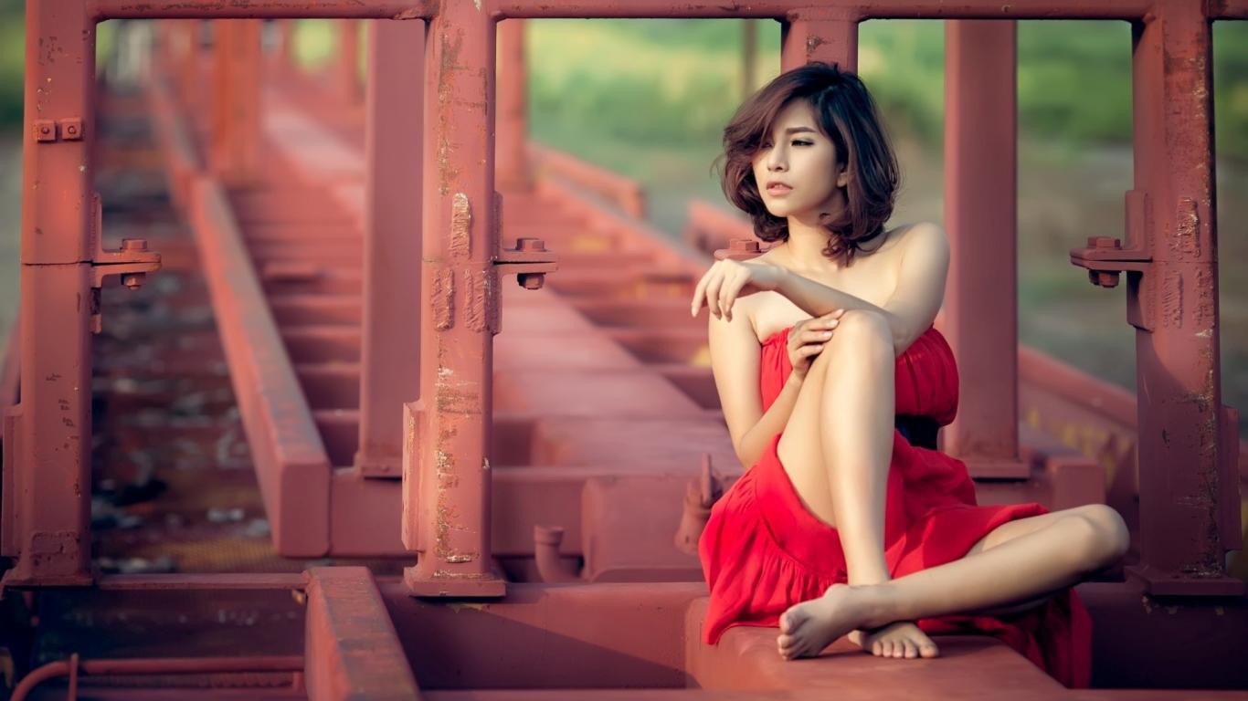 Wallpaper Asian brunette in a red dress