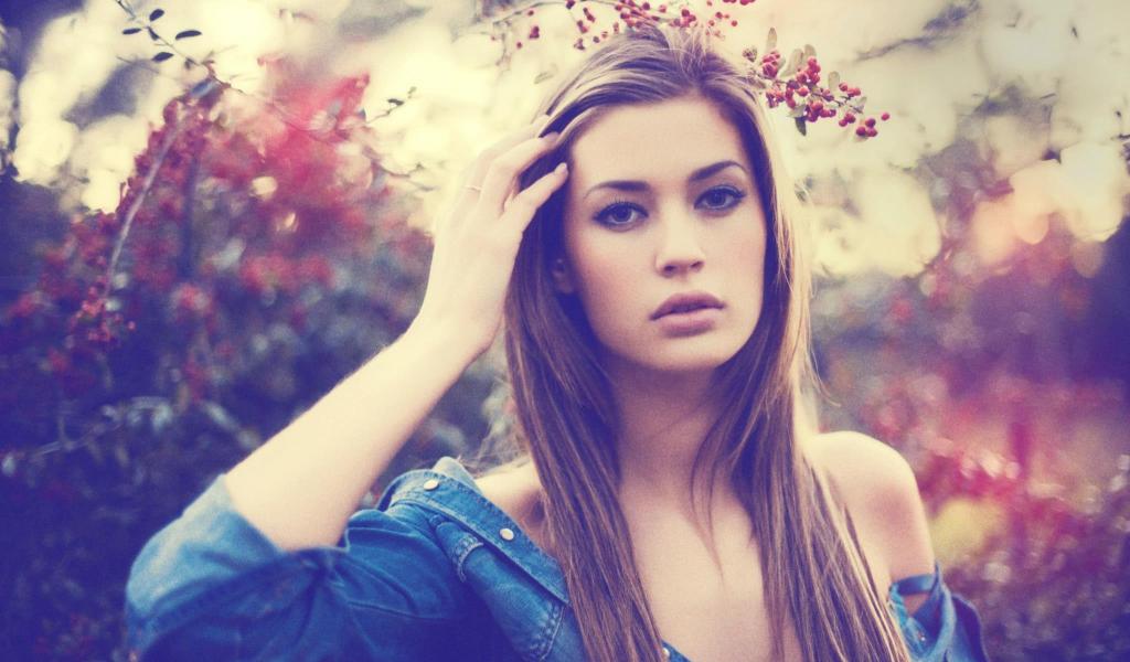 Wallpaper Cute brunette on background of mountain ash