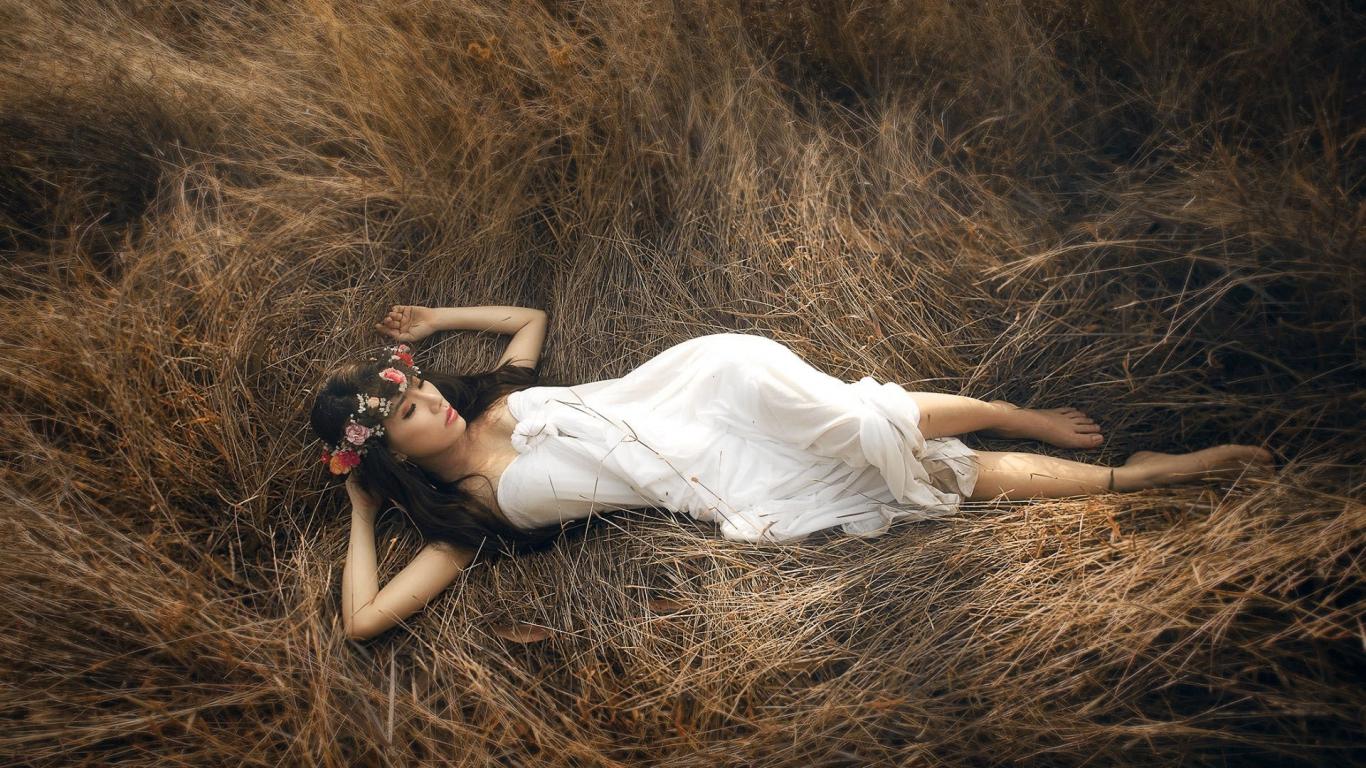 Wallpaper Girl lying on the dry grass