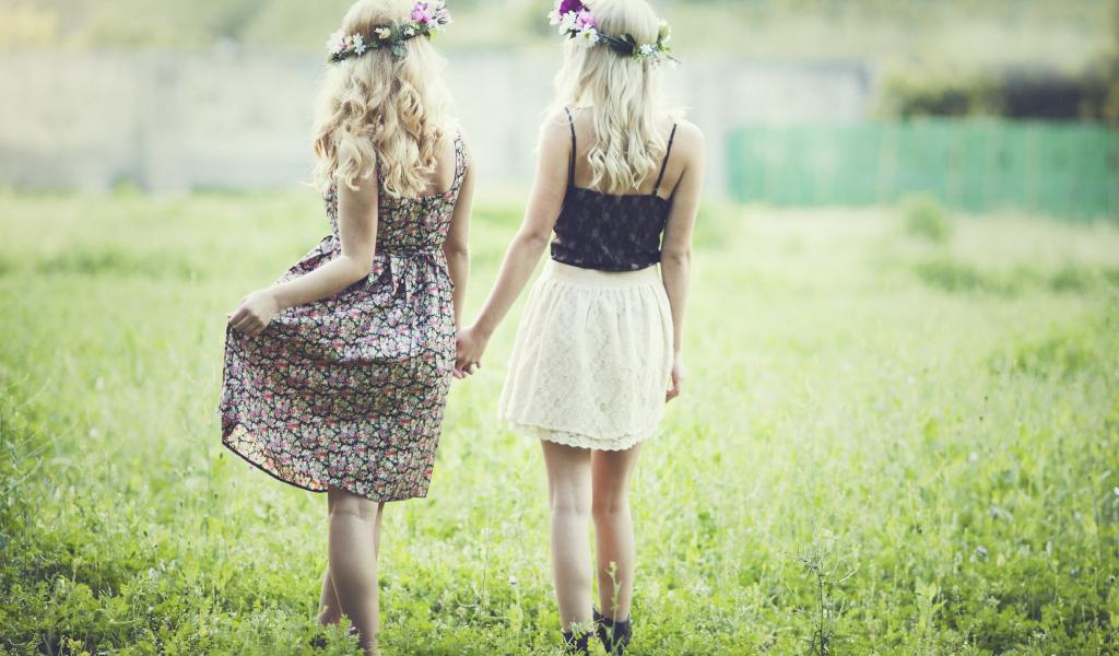 Wallpaper Two blondes are walking on the lawn