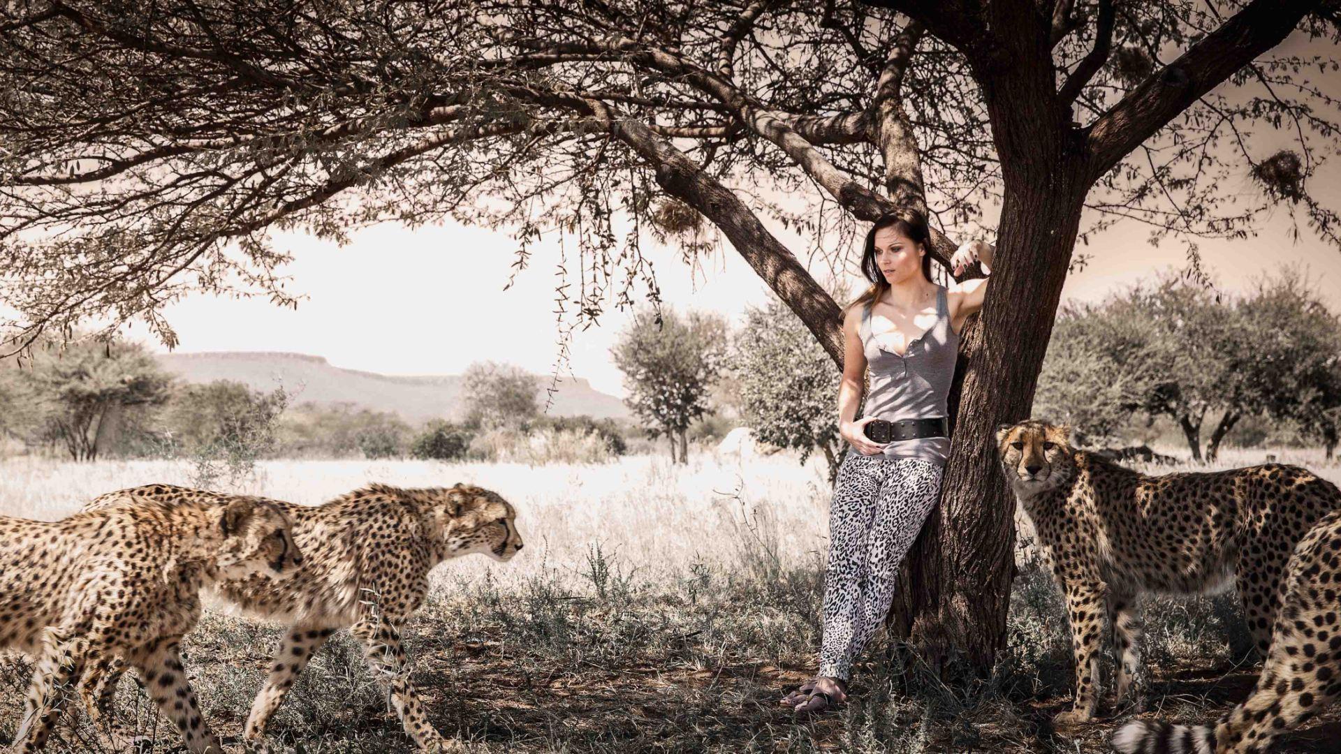 Wallpaper Girl among leopards