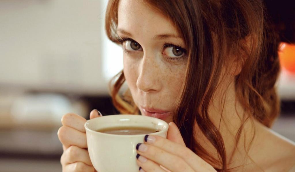 Wallpaper Girl with freckles drinking coffee