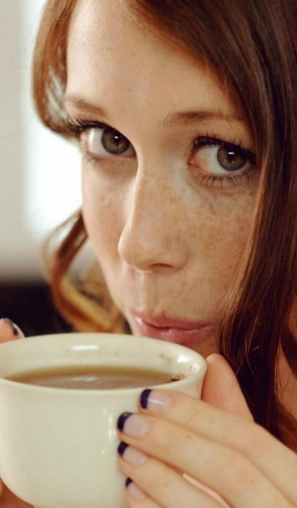 Wallpaper Girl with freckles drinking coffee