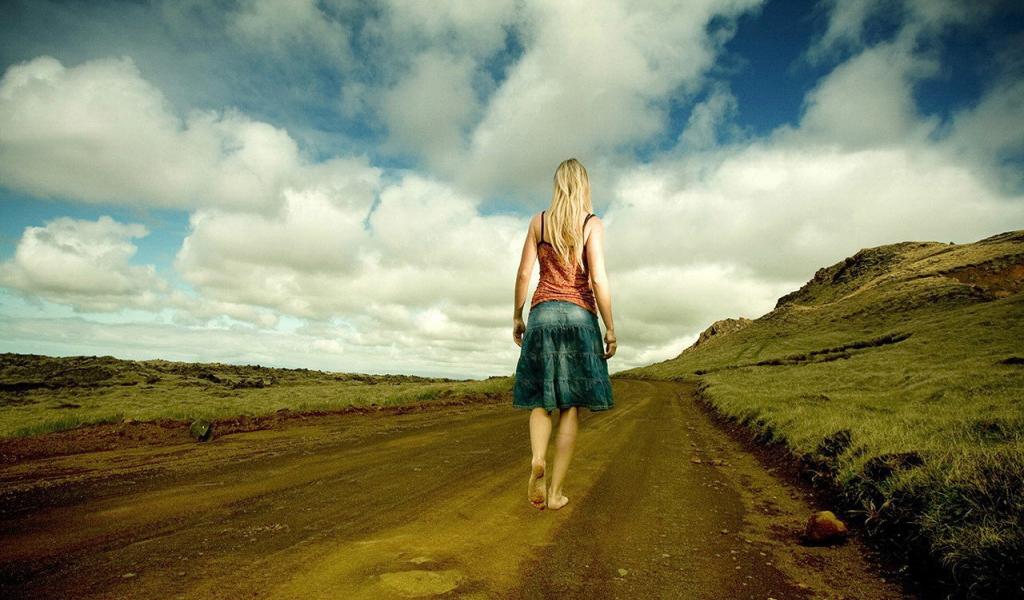 Wallpaper Barefoot girl on the road
