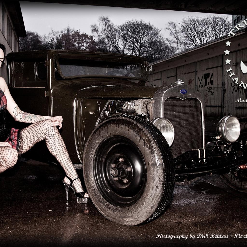 Wallpaper Girl near green retro car