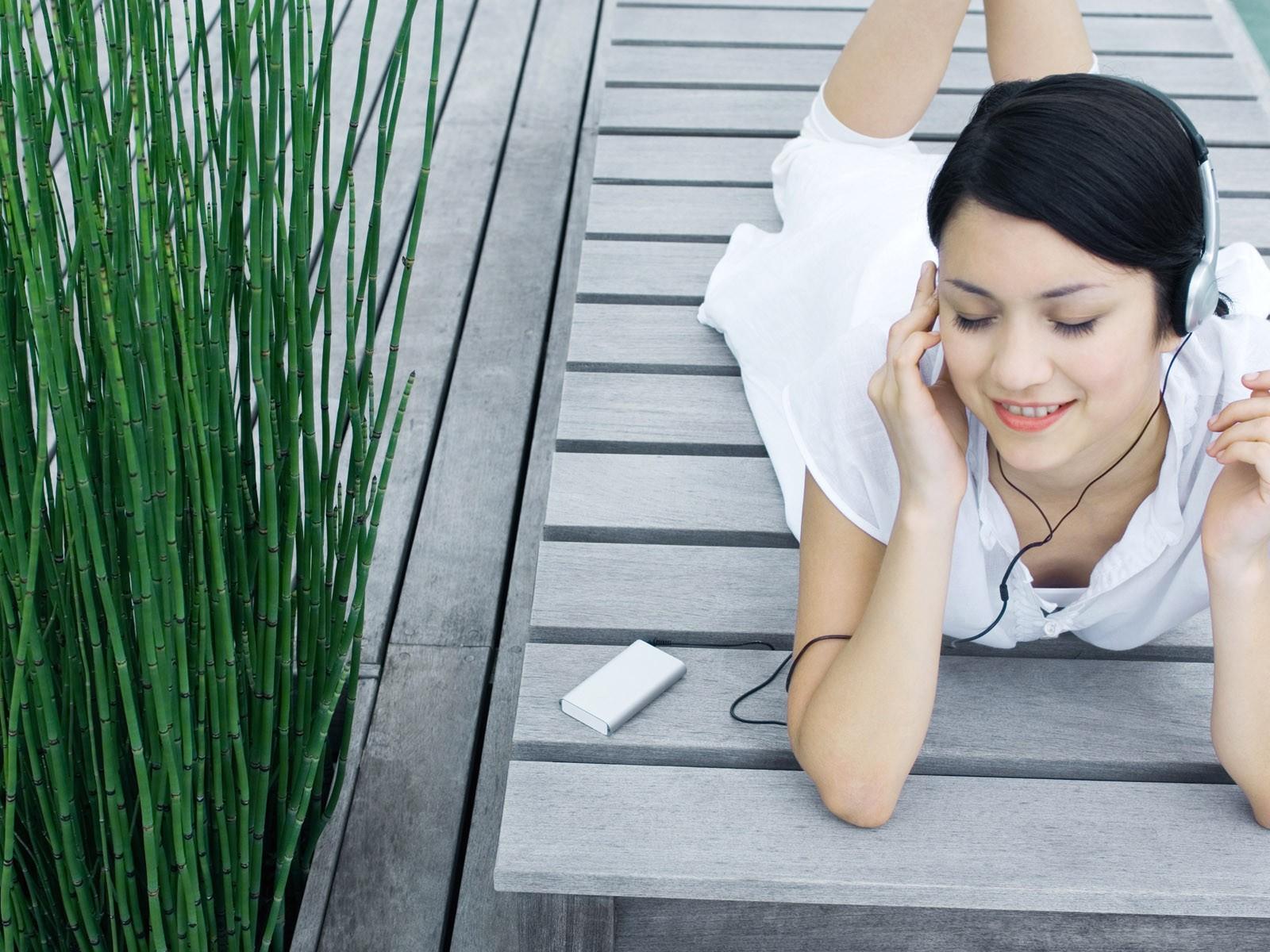 Wallpaper The girl in the white dress listening to music