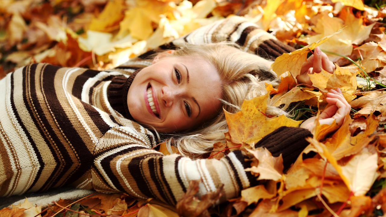 Wallpaper Happiness, Smile, Leaves, lies, Autumn leaves