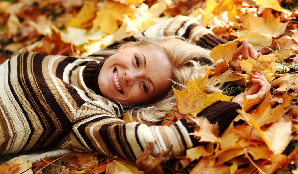 Wallpaper Happiness, Smile, Leaves, lies, Autumn leaves
