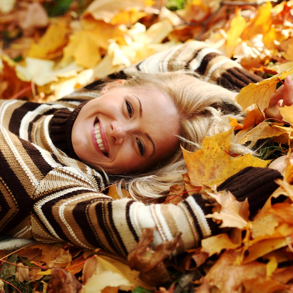 Wallpaper Happiness, Smile, Leaves, lies, Autumn leaves