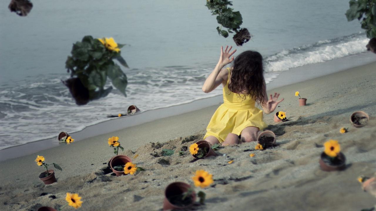 Wallpaper Model in a yellow dress among the flowers on the beach