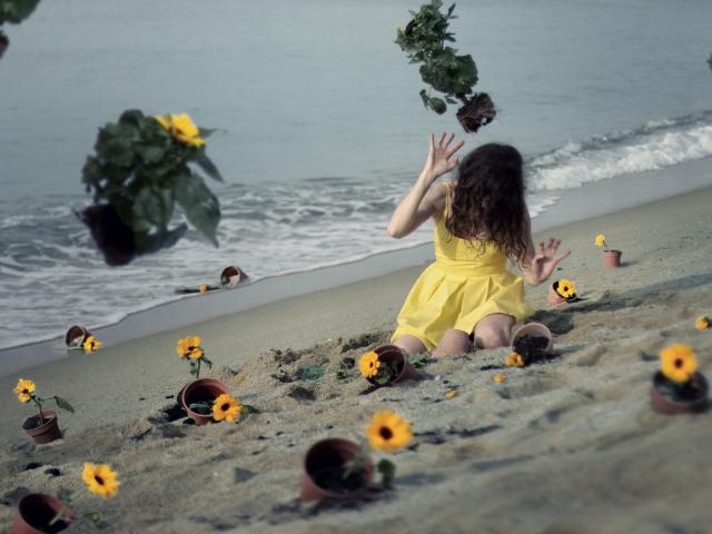 Wallpaper Model in a yellow dress among the flowers on the beach