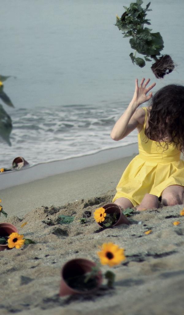 Wallpaper Model in a yellow dress among the flowers on the beach