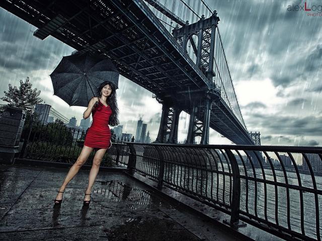 Wallpaper Model in a red dress with an umbrella standing under a bridge