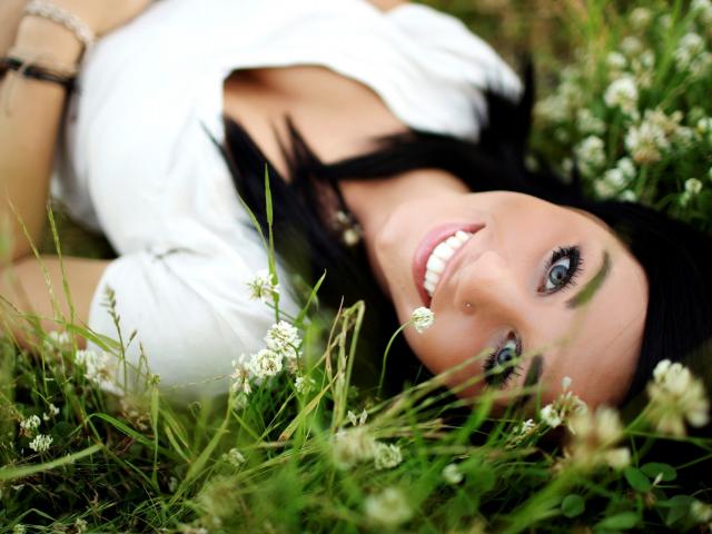 Wallpaper Brunette girl with piercing in the nose lies in the grass