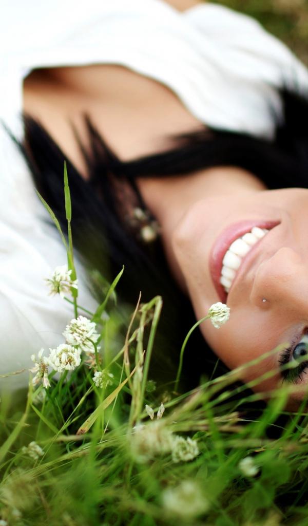 Wallpaper Brunette girl with piercing in the nose lies in the grass