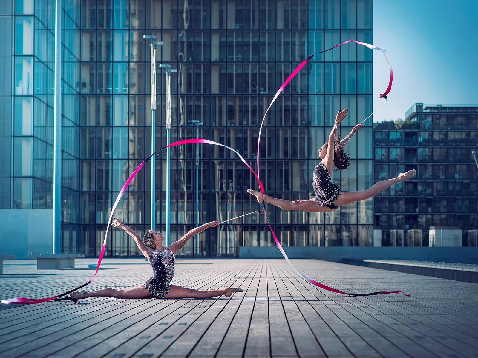 Wallpaper The gymnasts with ribbons in the square in front of a skyscraper