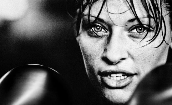 Wallpaper Girl in boxing gloves, black and white photo