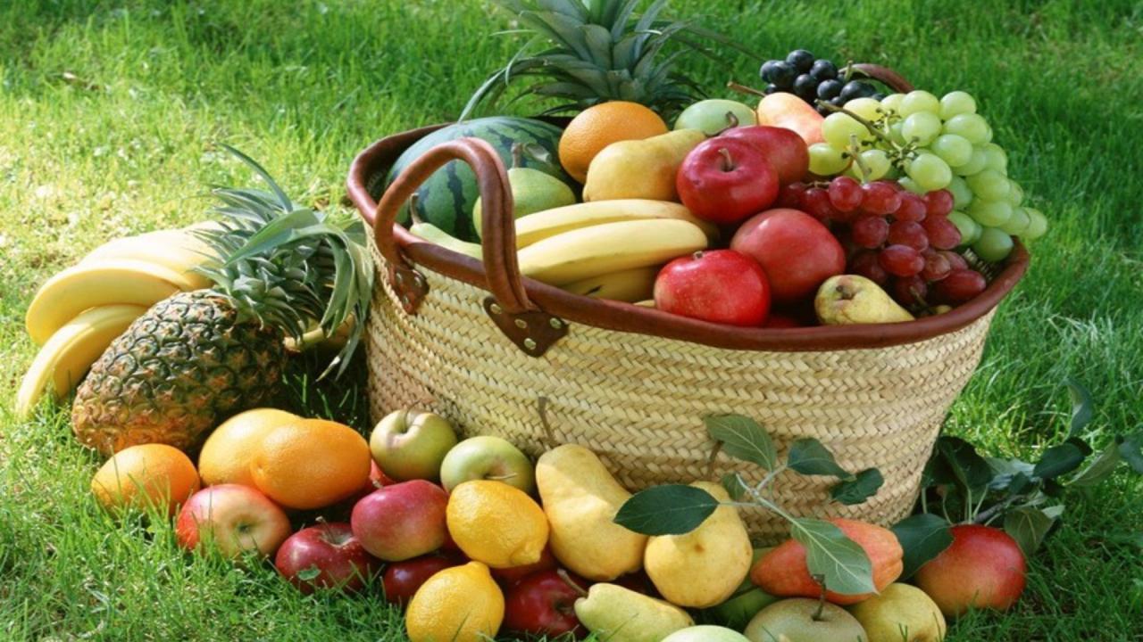 Wallpaper Basket of various fruit on a green lawn