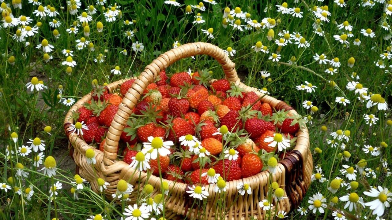 Wallpaper Basket of strawberries among daisies