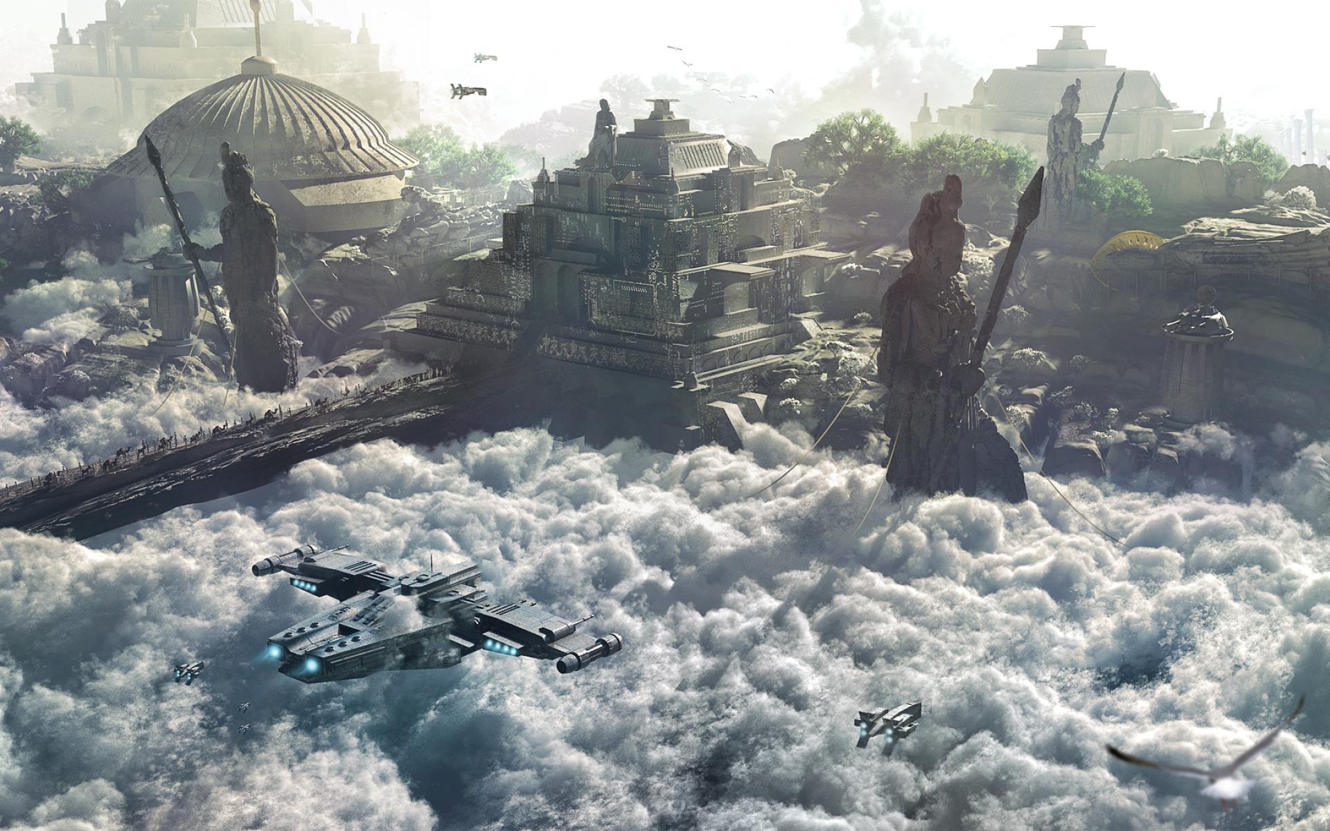 Wallpaper Spaceship front of the temple advanced civilization