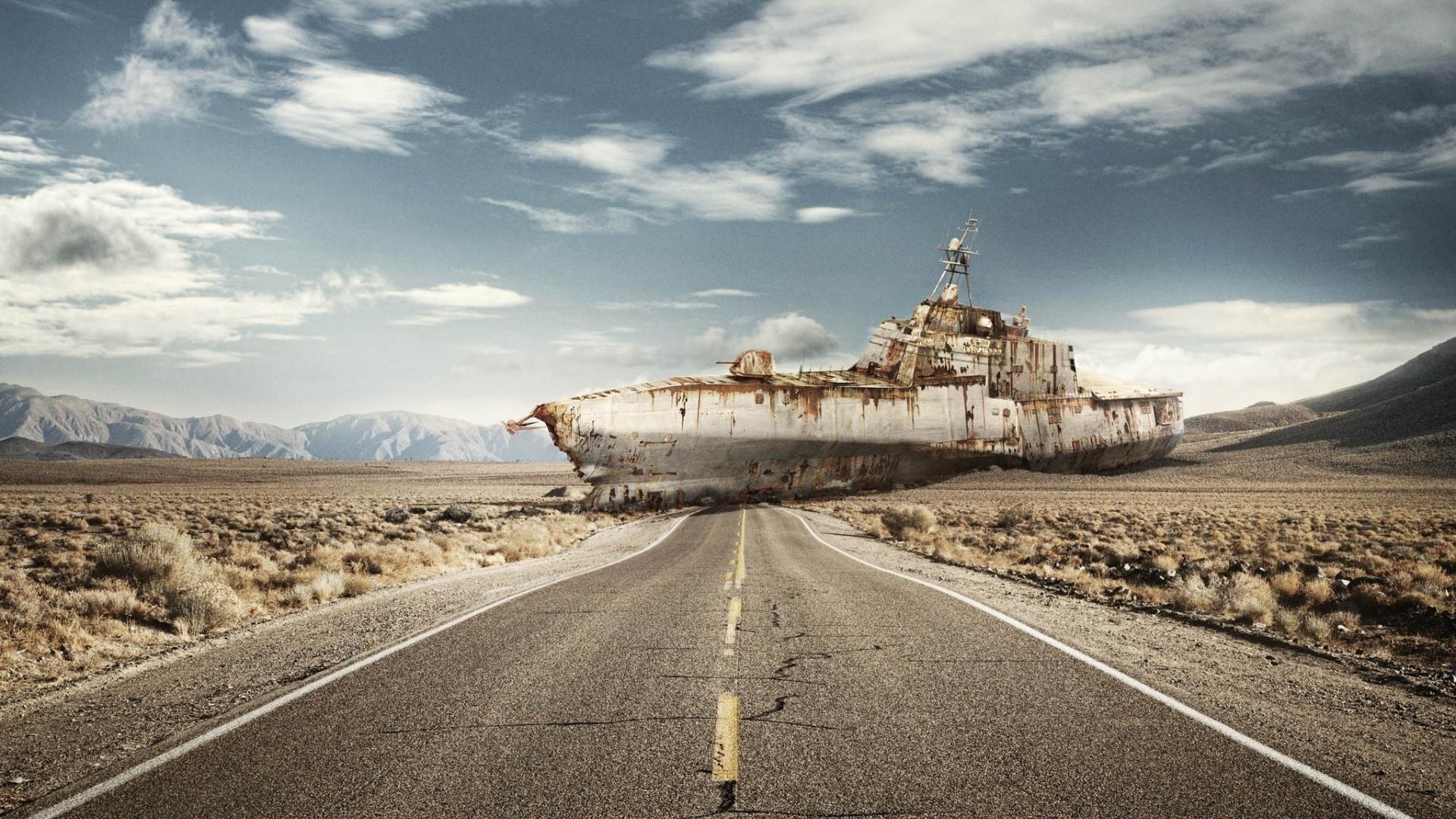 Wallpaper Rusty ship blocked the road in the desert