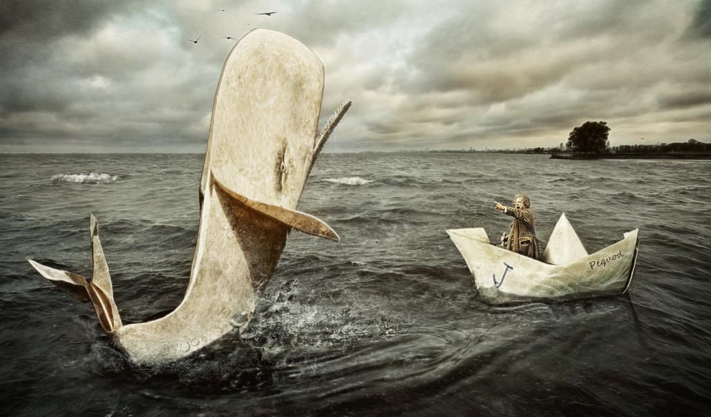 Wallpaper A man in a paper boat and whale