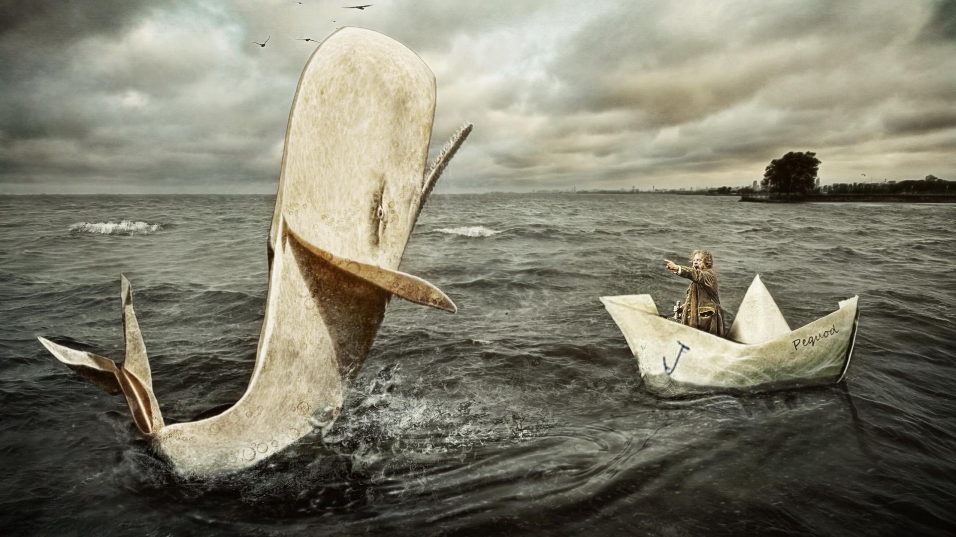 Wallpaper A man in a paper boat and whale