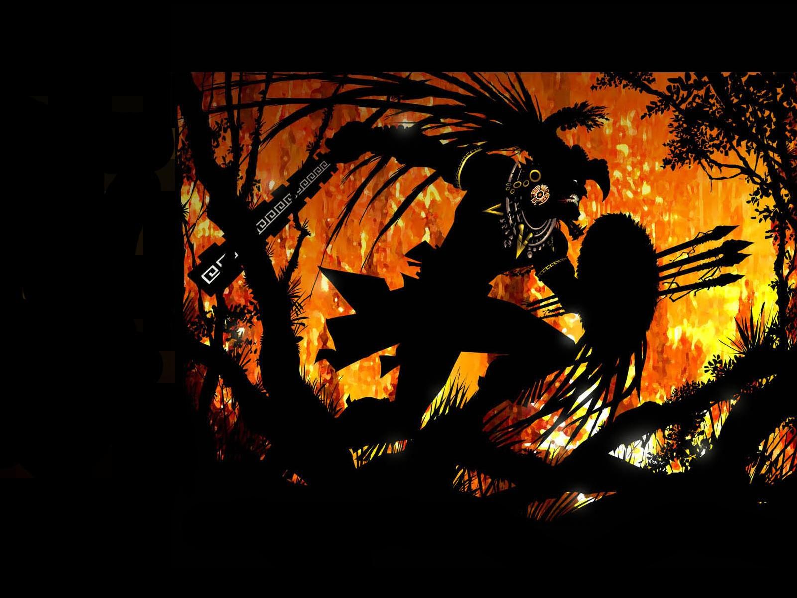Wallpaper Aztec Warrior in a burning forest