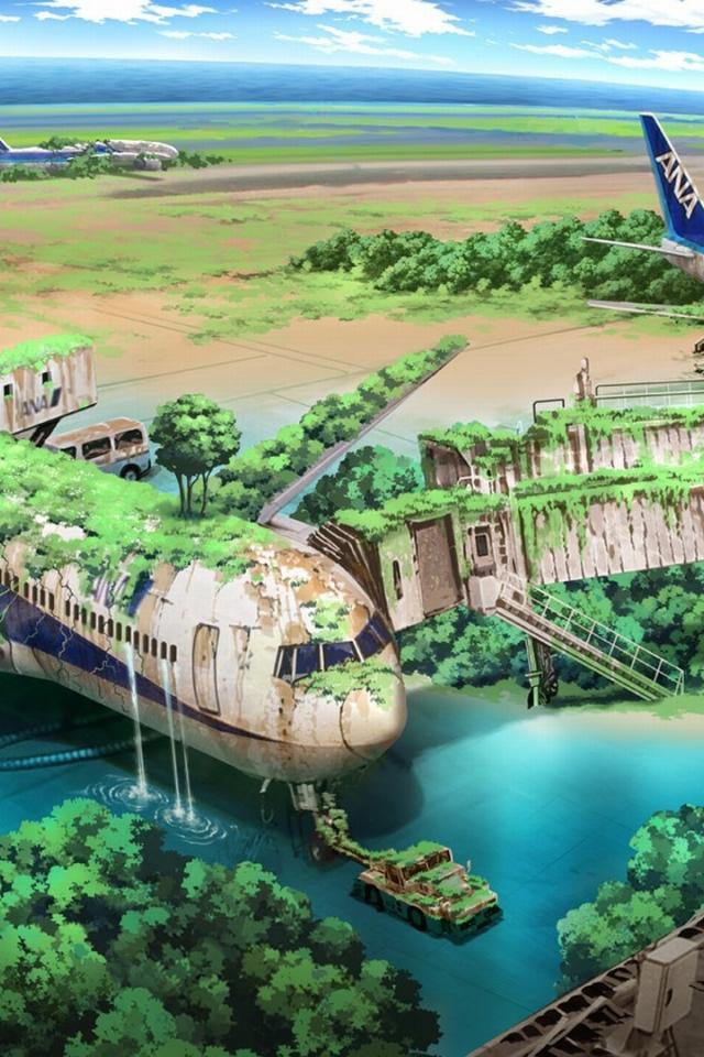 Wallpaper Grass-covered ruins of the airport