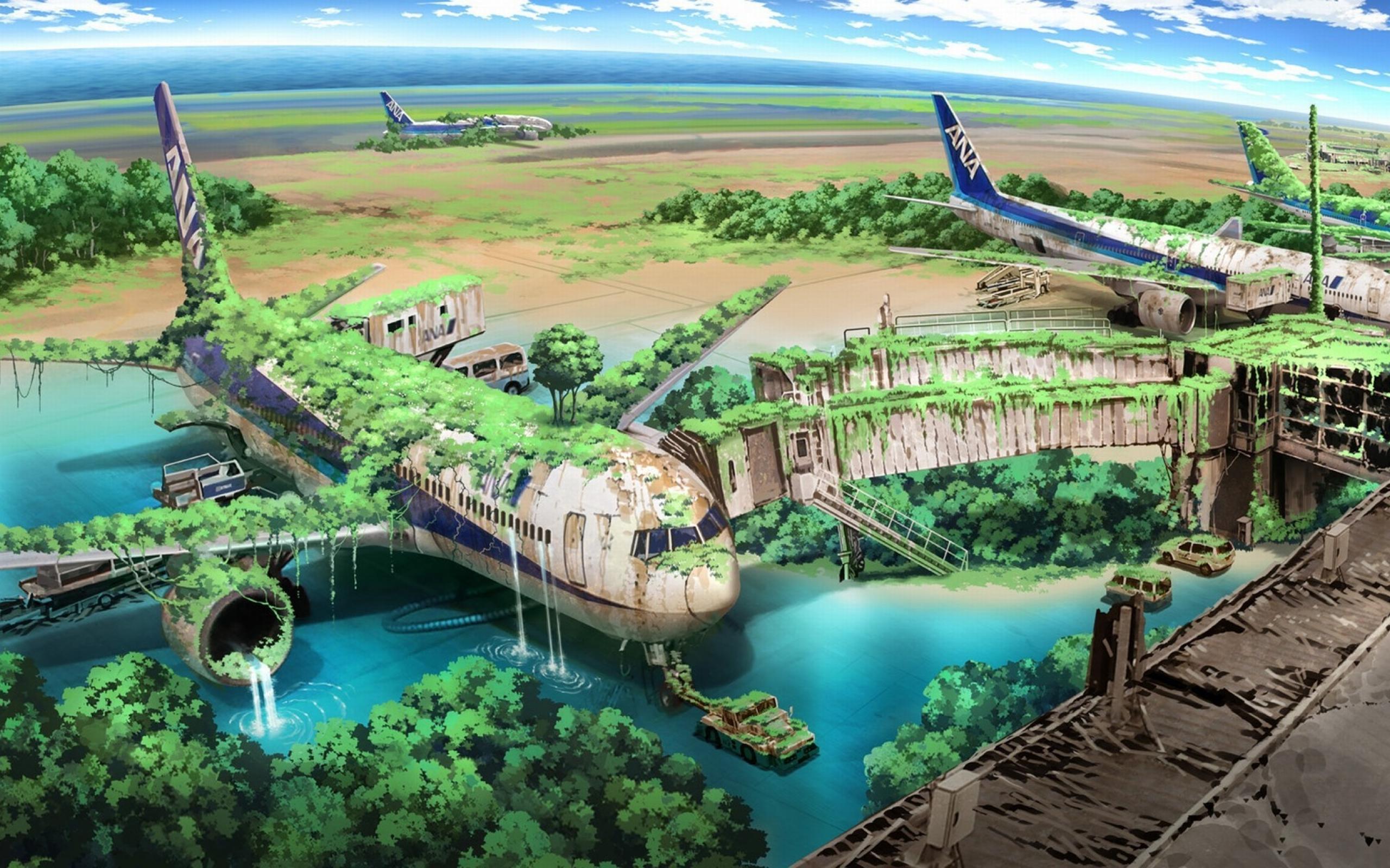 Wallpaper Grass-covered ruins of the airport