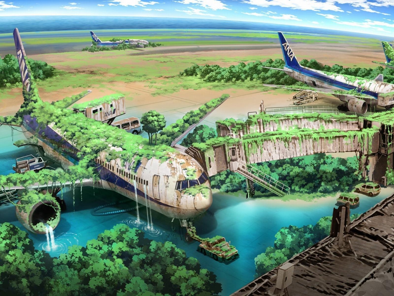 Wallpaper Grass-covered ruins of the airport